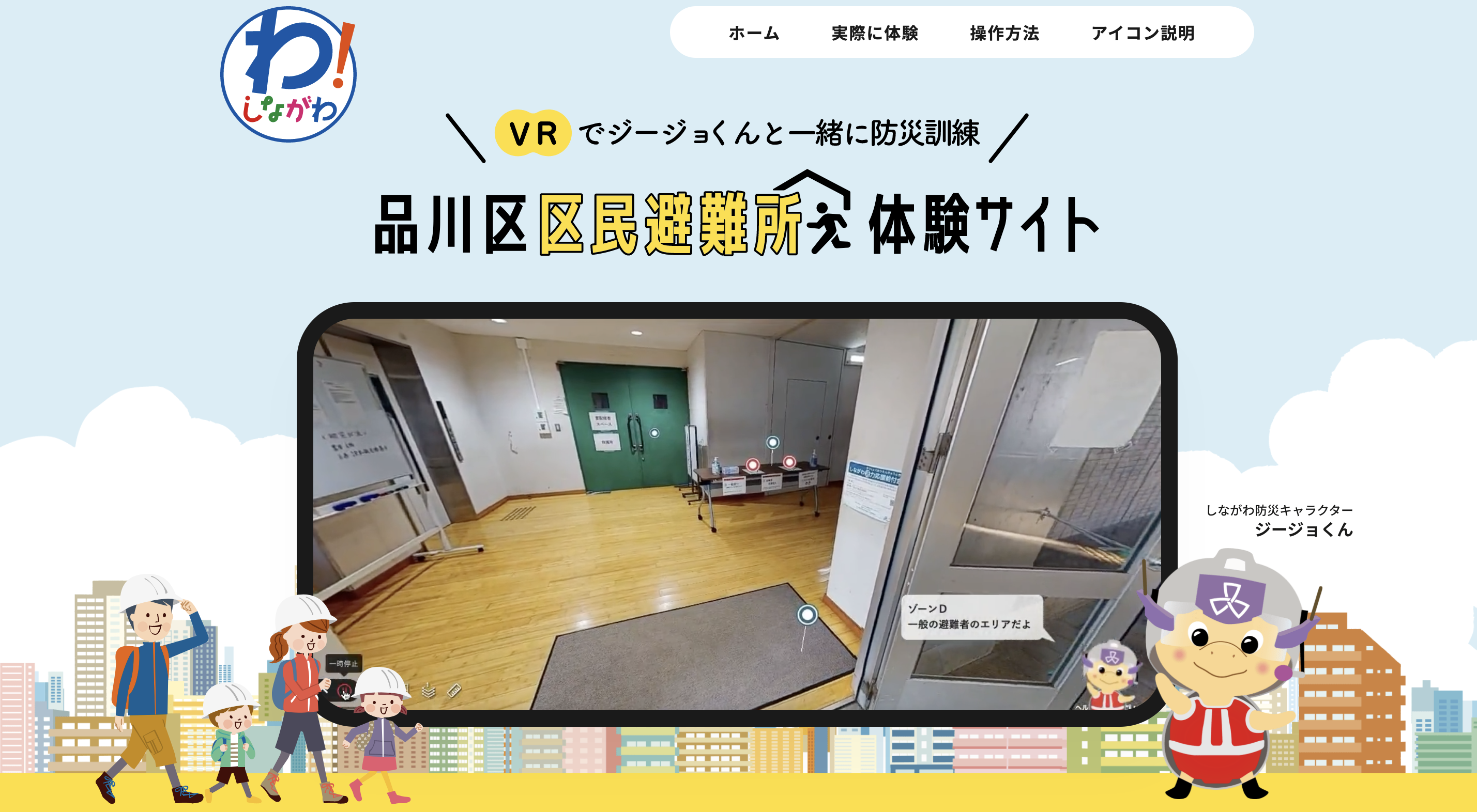 区民避難所体験コンテンツ「~VRでジージョくんと一緒に防災訓練~」では、災害の際に近隣住民の生活を支える区民避難所をVR化しました。普段の生活では馴染みのない避難所内部の様子や、災害が起こって避難した際の受付の流れを、現地で見学するのと同じように知ることができるコンテンツとなっています。また、コンテンツ内では、しながわ防災キャラクター「ジージョくん」が各ポイントで受付の流れを分かりやすく説明しています。このように、画面上に機能を加えることができるのもVR360の特徴です。選べる追加機能によって、訪れた方に特別な体験と印象を与え、より知ってもらう・見てもらうために最適なサービスとなっています。